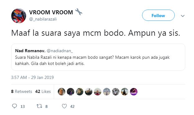 "Suara Nabila Razali ni kenapa macam bodoh sangat? Macam karok pun ada jugak kahkah. Gila dah kot boleh jadi artis," tulis seorang pengguna Twitter.