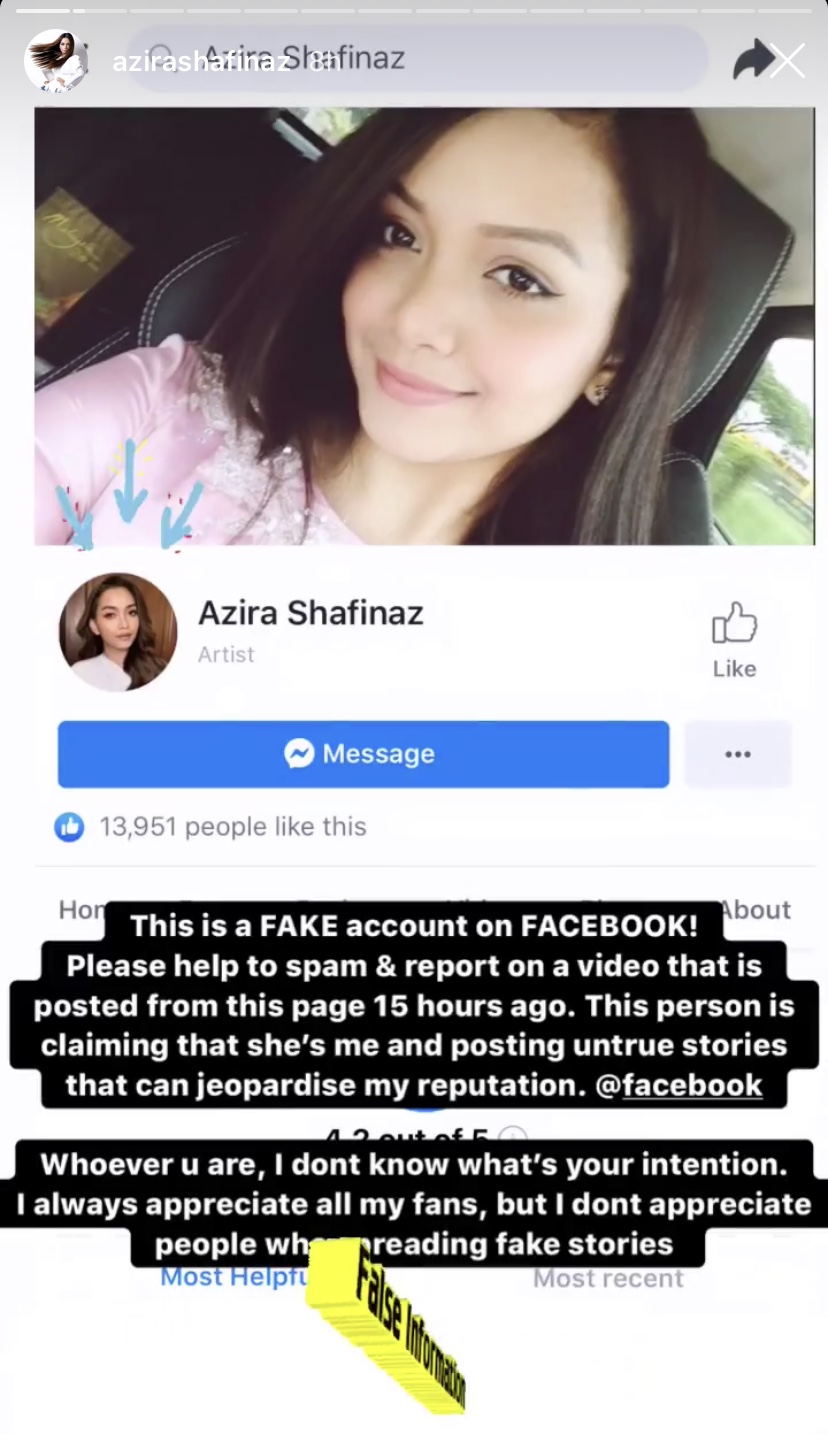 Pelakon dan anggota kumpulan De Fam Azira Shafinaz mendedahkan terdapat sebuah akaun Facebook palsu yang menyamar sebagai dirinya.