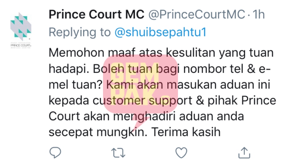Tweet tersebut telah mendapat perhatian daripada hospital tersebut lalu permohonan maaf telah dibuat.