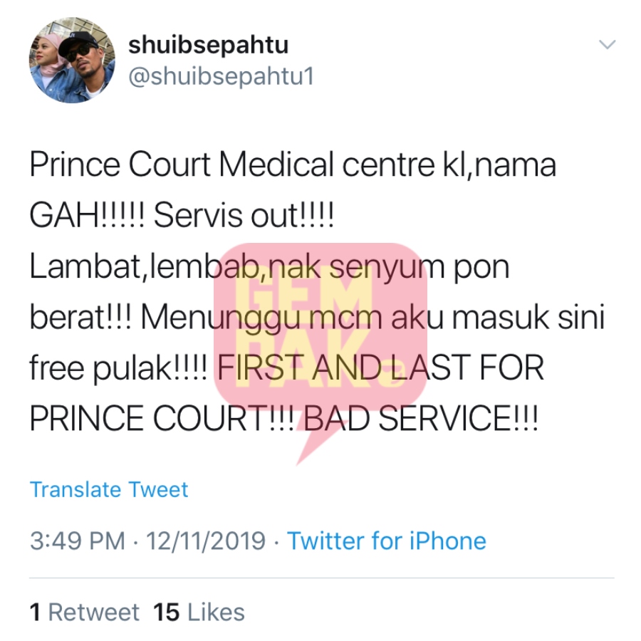 Pelawak dan penyampai radio, Shuib Sepahtu kesal dengan servis sebuah hospital swasta yang dikunjunginya semalam.