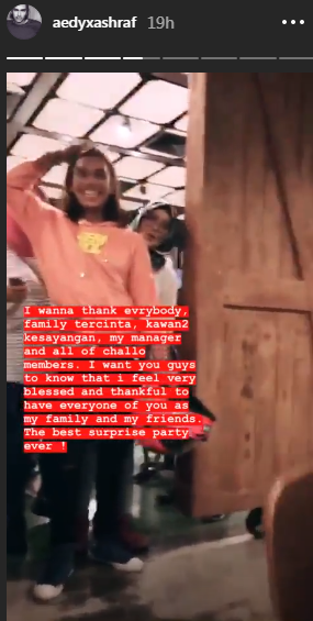 Selain itu, Aedy turut berkongsi foto dan video bersama keluarga dan rakan-rakan yang meraikan hari istimewanya itu di ruangan Instagram Story miliknya.