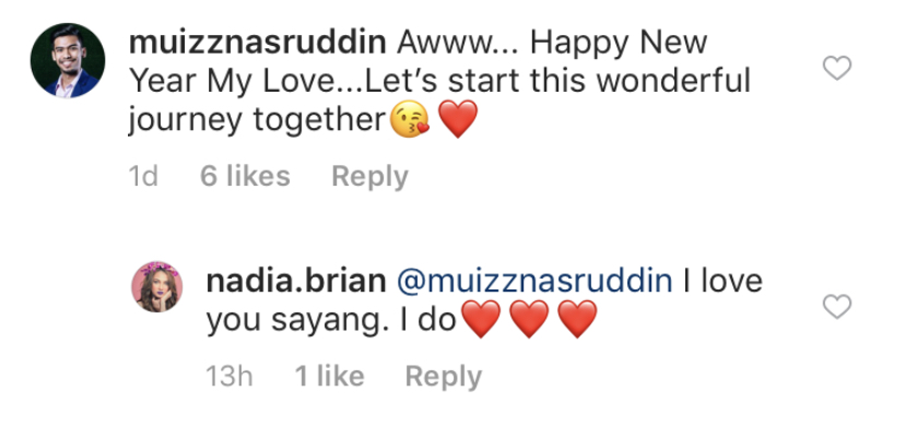 Menerusi entri di Instagram, Nadia mendedahkan jejaka yang dikenali dengan Mu'izz Nasruddin adalah kekasihnya serta menganggap ini adalah permulaan tahun baru yang indah.