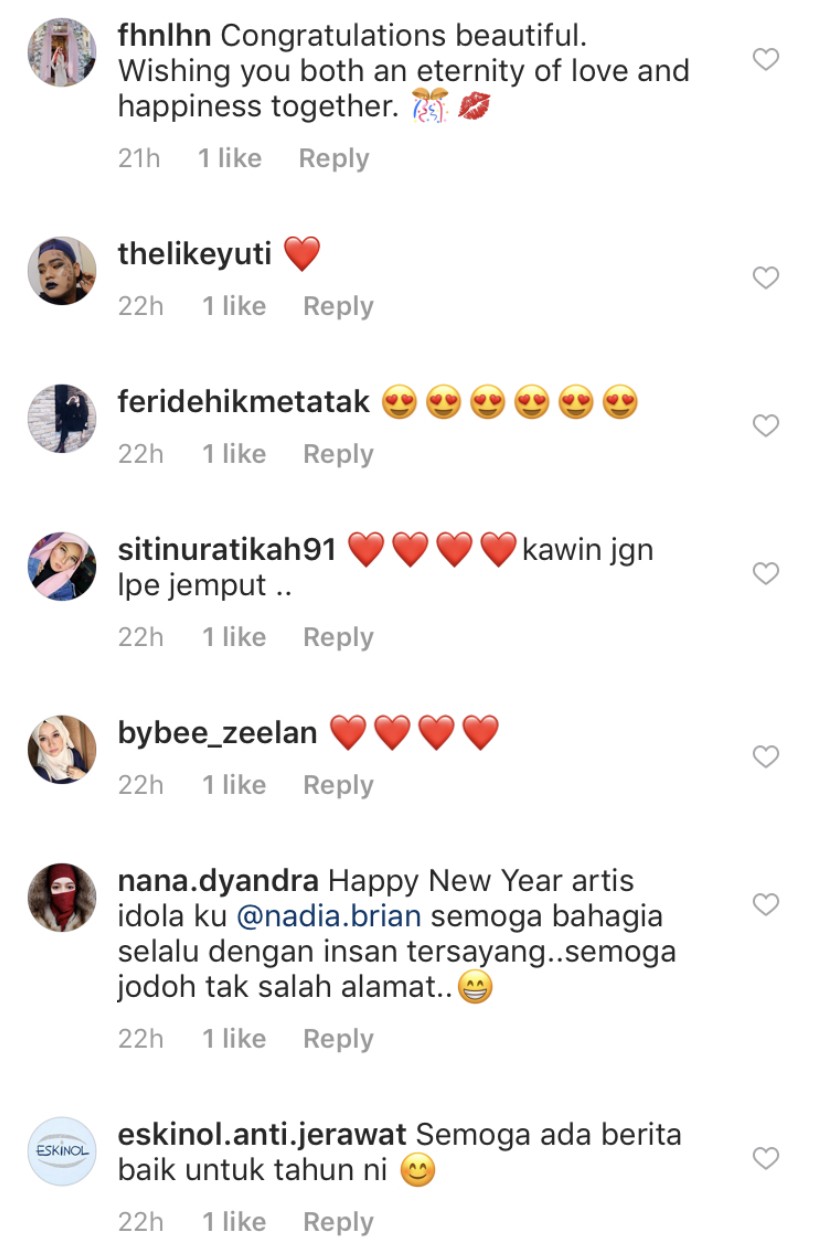 Rata-rata rakan artis serta peminatnya turut berkongsi rasa gembira serta mendoakan pasangan merpati dua sejoli itu disatukan.