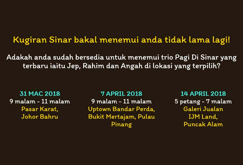 Dalam pada itu, penyampai-penyampai SINAR seperti Jep, Rahim, Angah, SY, Adi, Abby dan Jamal akan turut memeriahkan penjelajahan ini.