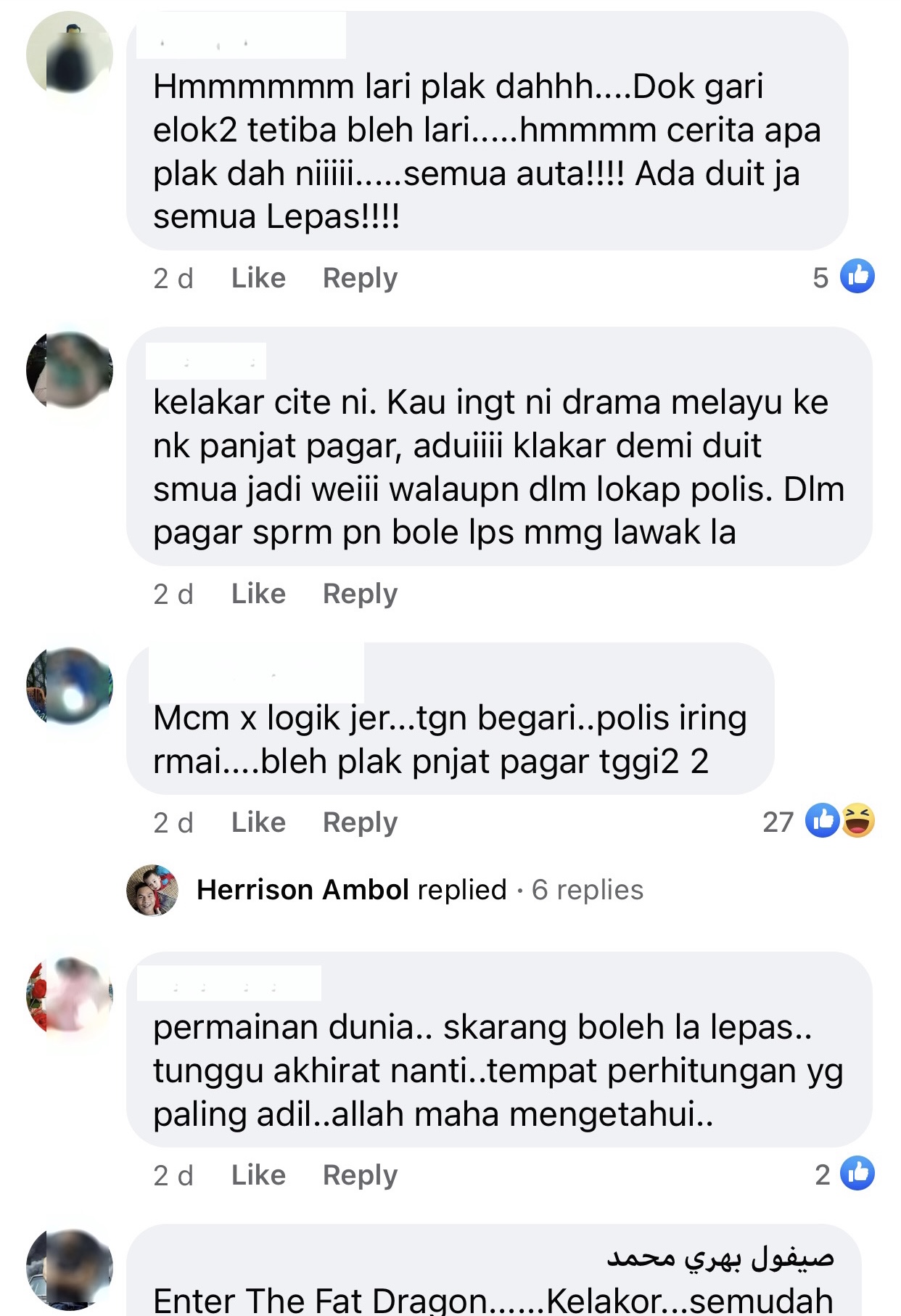 “Segendut mana pun orang tu, jika cukup duit, tembok China pun dia panjat dan menghilangkan diri,” katanya sebagai kapsyen.