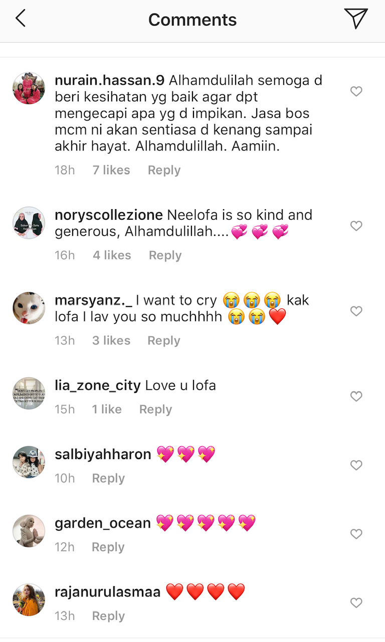 Di ruangan komen, peminat memuji kebaikan hati Neelofa dan menyifatkan jasa majikan seperti Neelofa akan sentiasa dikenang sehingga ke akhir hayat.