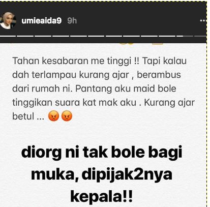 Datin Seri Umie Aida meluahkan rasa geramnya di laman sosial Instagram (IG) apabila pembantu rumahnya bertindak biadab dengan meninggikan suara terhadap ibunya.