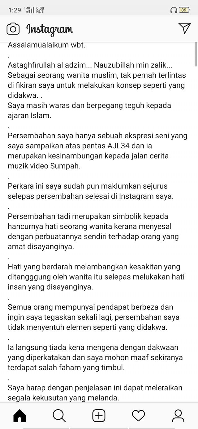 “Saya masih waras dan berpegang teguh kepada ajaran Islam. “Persembahan saya hanya sebuah eskpresi seni yang saya sampaikan atas pentas AJL 34, dan saya sudah maklumkan mengenainya sejurus selepas membuat persembahan,” tegasnya.