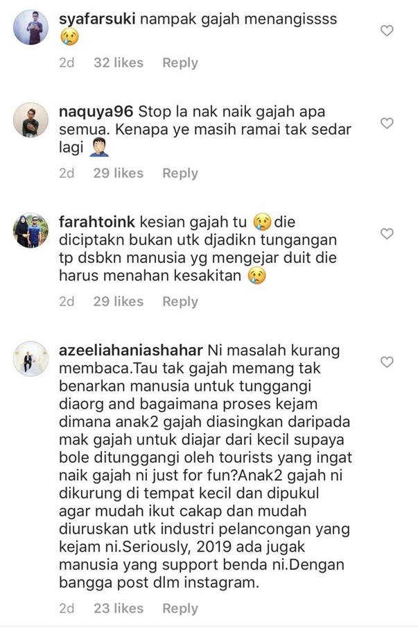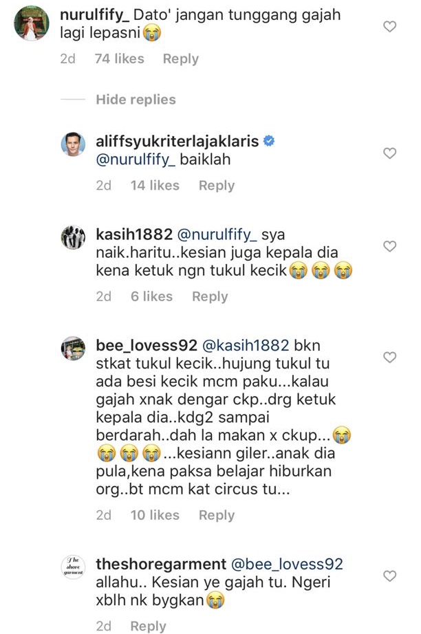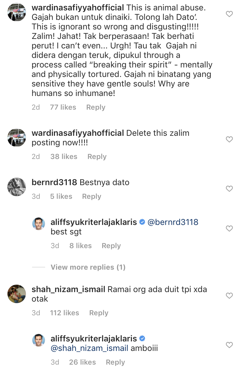 Usahawan kosmetik terkenal, Datuk Seri Aliff Syukri dikecam netizen selepas memuat naik foto sedang menunggang seekor gajah semasa berada di Thailand.