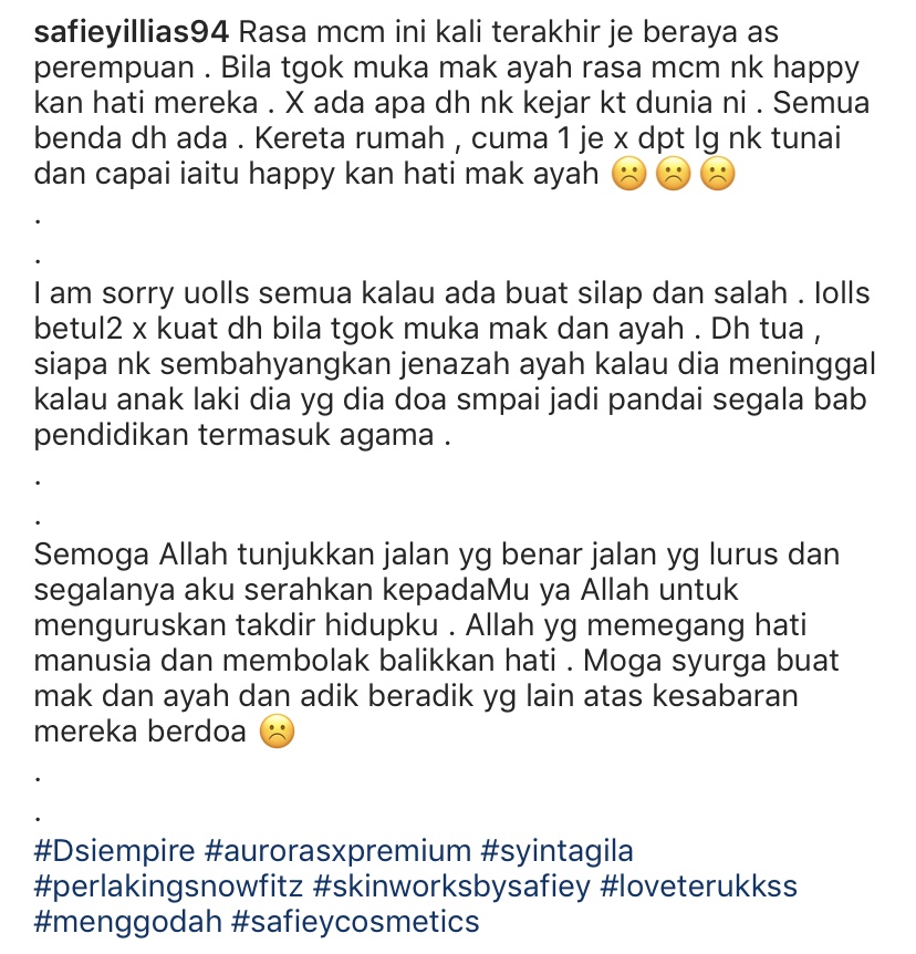 "Saya minta maaf semua kalau ada buat silap dan salah. Saya betul-betul tak kuat dah bila tengok muka mak dan ayah.