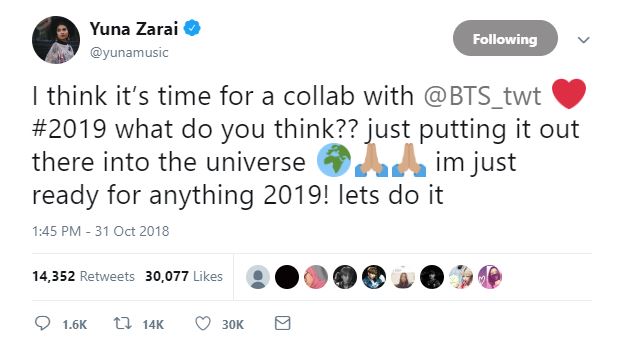 “Saya fikir sudah tiba masanya untuk berkolaborasi dengan @BTS_Twt #2019. Apa pendapat anda?