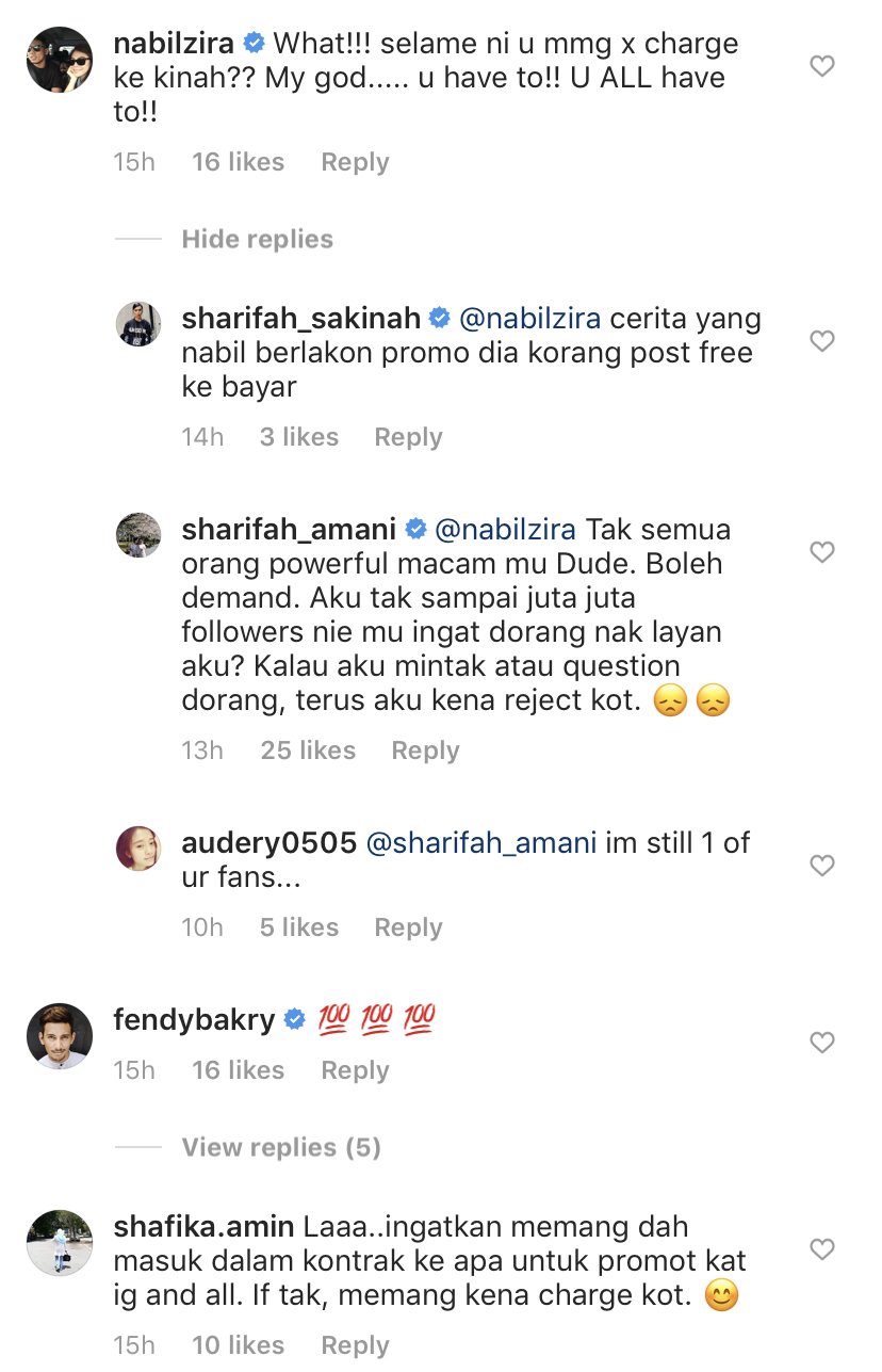 Di ruangan komen, rata-rata pengikut dan rakan artis terkejut malah memintanya untuk mengenakan bayaran untuk setiap promosi di ruang Instagram (IG).