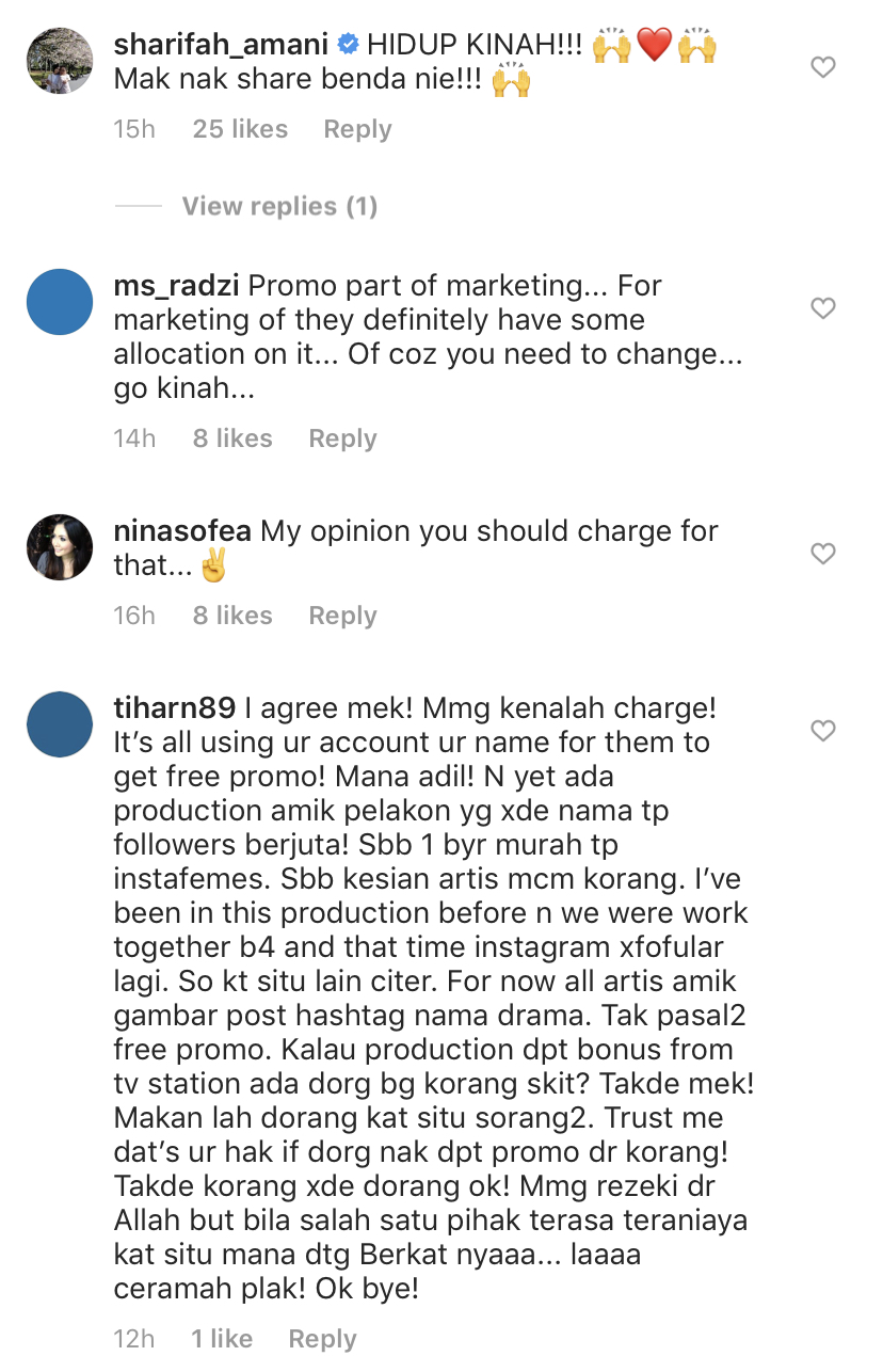 "Nampak sangat stesen TV cuba kaut untung dengan membayar pelakon hanya untuk lakonan mereka namun mengharapkan promosi percuma kepada jutaan pengikut tanpa membayar satu sen kepada kami.
