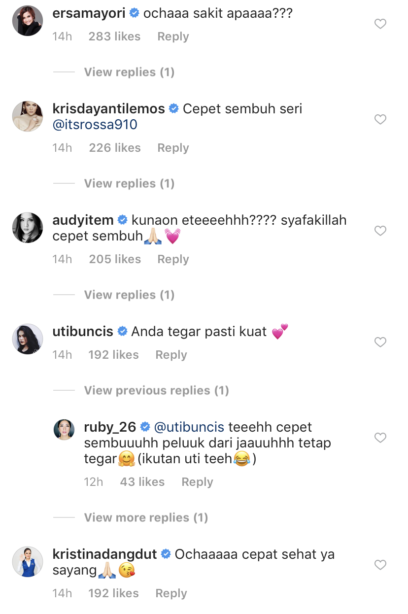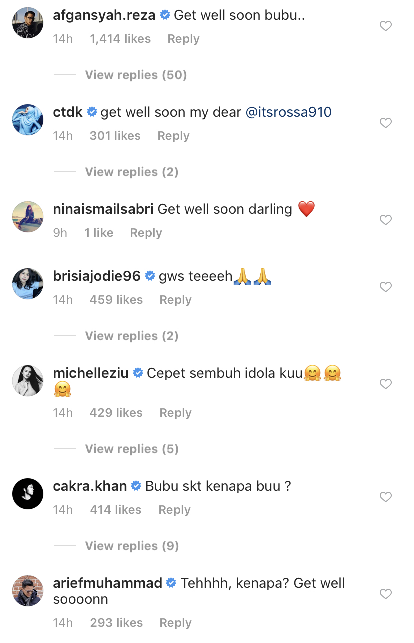 Rata-rata peminat serta rakan artis risau dengan keadaannya meninggalkan komen mendoakan semoga Rossa kembali sihat seperti biasa.