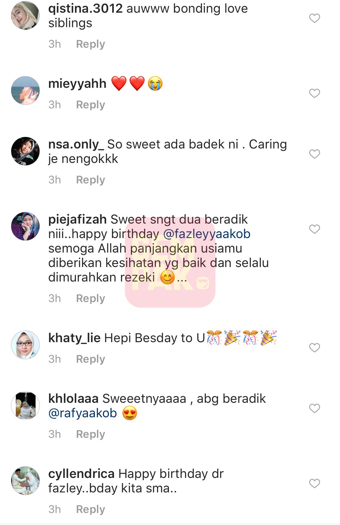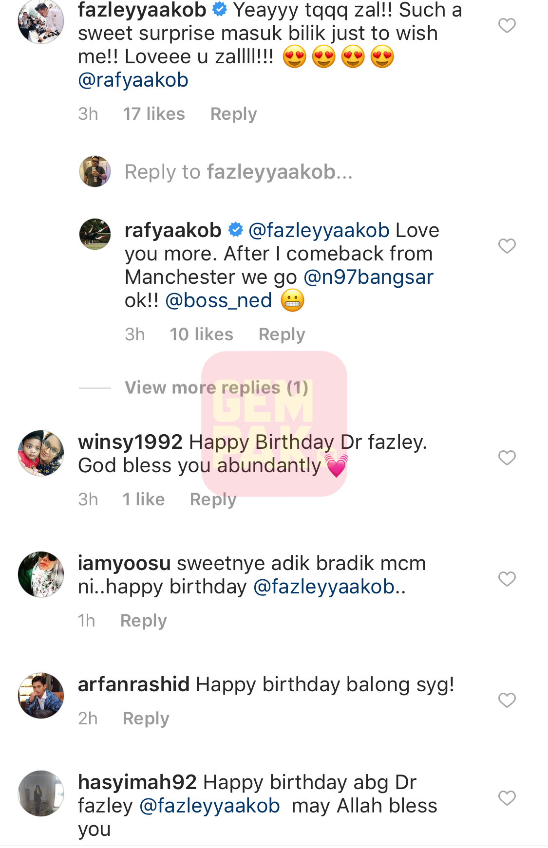 Yeay thank you Zal! Such a sweet surprise masuk bilik just to wish me! Love you Zal @rafyaakob," tulis Fazley di ruangan komen.