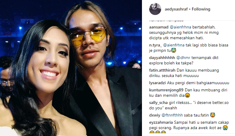 Peminat Aedy Ashraf patah hati selepas melihat pelakon itu mendedahkan gambar swafoto bersama seorang wanita ketika menghadiri Anugerah MeleTOP (AME2018) pada Ahad.