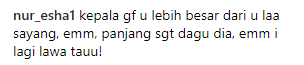 “Kepala gf you lebih besar dari you la sayang, emm, panjang sangat dagu dia, emm i lagi lawa tauu!,” -@nur_esha1