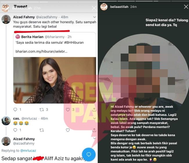 Dalam pada itu, melalui posting yang berbeza, pemilik nama Dayang Nabellah Awang Astillah dilihat meluahkan perasaan mengenai tanggapan orang ramai terhadap Aliff.
