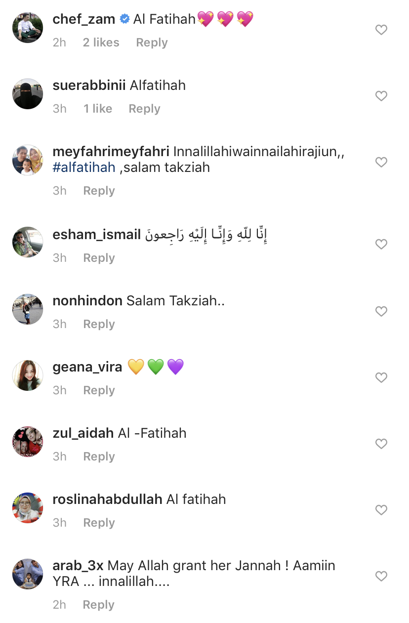 "Tetapi awak akan sentiasa kekal di dalam doa kami. Terima kasih banyak aunty. Kami sayang awak. Semua orang tolong doakan my Aunty Hajah Latipha binti Salim. Terima kasih. Innalillahwainailaihirojiuun," luahnya.