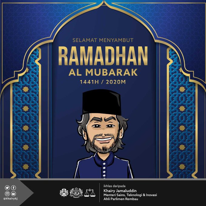 Menteri Sains, Teknologi dan Inovasi, Khairy Jamaluddin (KJ) masih mengekalkan penampilan rambut dan jambang beliau walaupun dijadikan ilustrasi kartun bagi poster ucapan Ramadan.