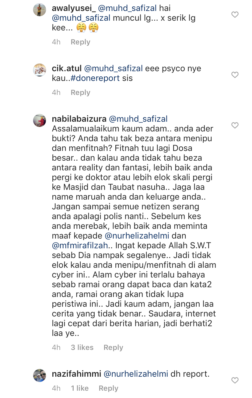Heliza tidak berdiam diri malah terus membalas komen tersebut dengan mengatakan akan membuat laporan polis kerana ia sudah keterlaluan.