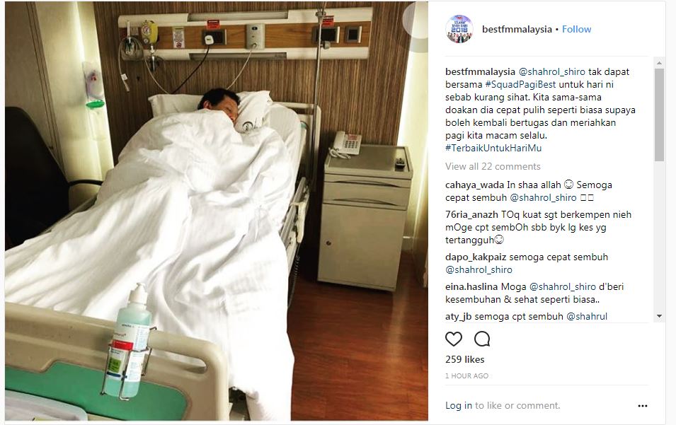 "@shahrol_shiro tak dapat bersama #SquadPagiBest untuk hari ni sebab kurang sihat. Kita sama-sama doakan dia cepat pulih seperti biasa supaya boleh kembali bertugas dan meriahkan pagi kita macam selalu," tulis stesen radio tersebut.