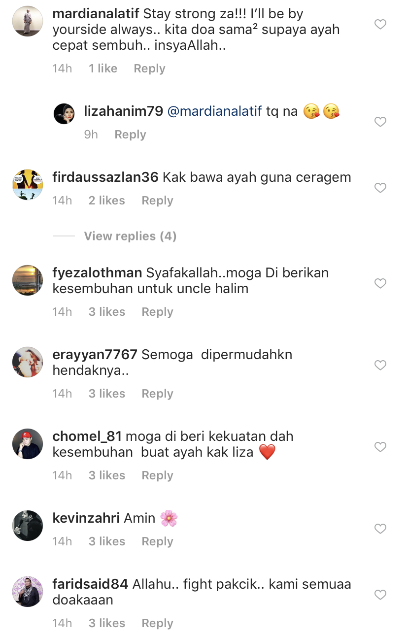 Menjengah di ruangan komen, rata-rata rakan artis dan peminat turut sama mendoakan kesembuhan ayahnya serta berharap Liza kuat menghadapi dugaan.