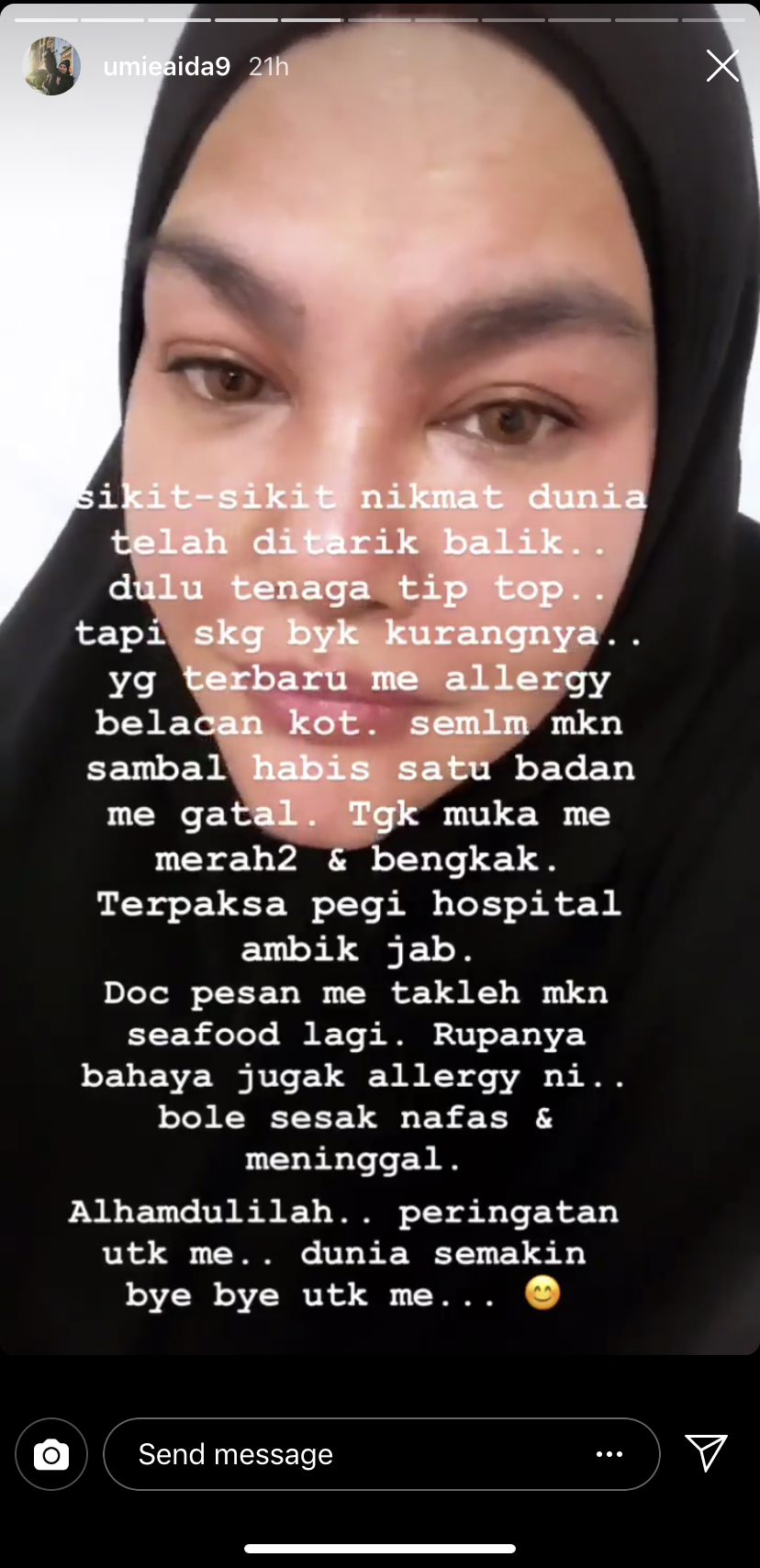 "Tengok muka me merah & bengkak. Terpaksa pergi hospital ambik jab," tulis Umie.