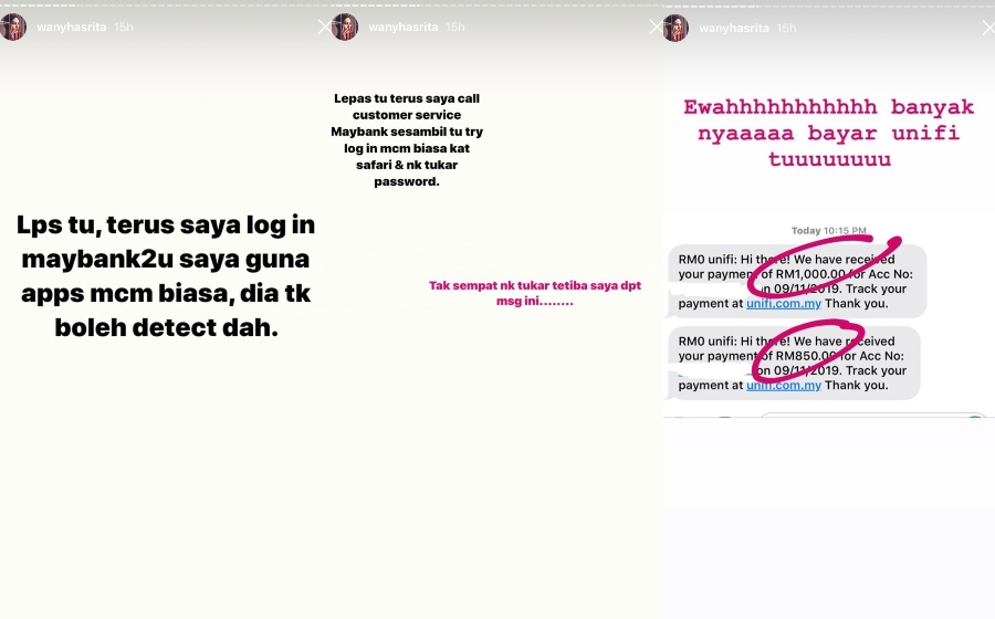 Tambah pelantun lagu Terlalu Memuja ini, dia tidak sempat untuk menukar kata laluan akaunnya kerana menyedari pemindahan wang sudah dibuat.
