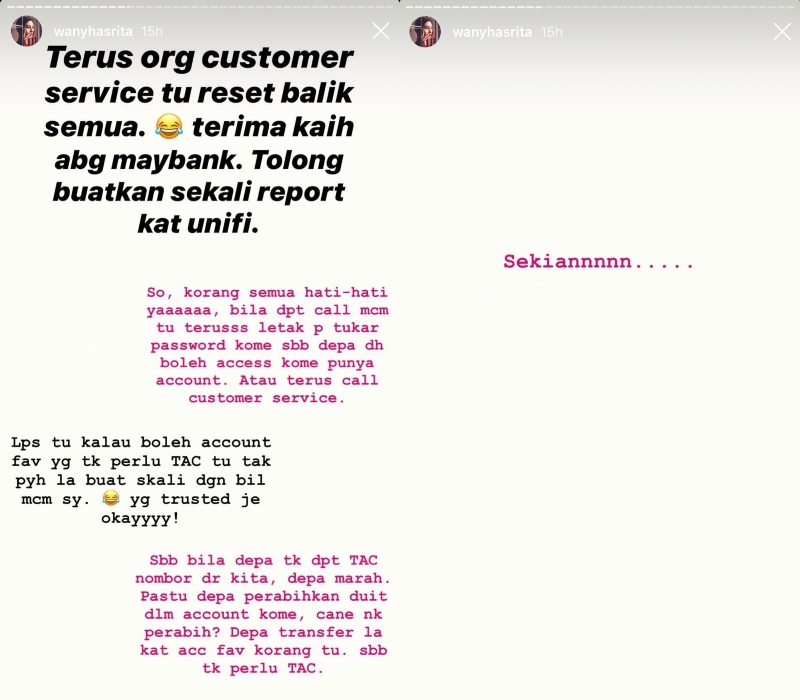 "Terus orang customer service tu reset balik semua. Terima kasih abang Maybank. Tolong buatkan sekali report kat Unifi.