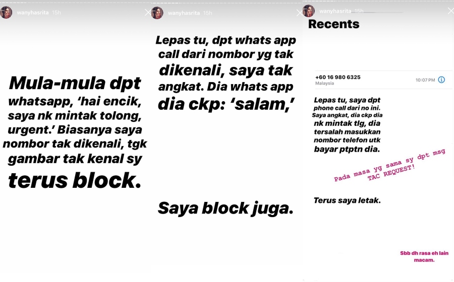 "Pada masa yang sama saya dapat mesej TAC request! Terus saya letak. Sebab dah rasa eh lain macam," tulis Wany.