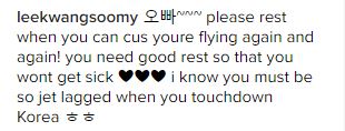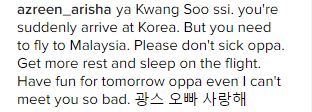 Sehingga kini rata-rata komen yang diterima oleh Kwang Soo di akaun Instagramnya meminta pelakon itu berehat sebaik mungkin selepas tiba di Malaysia nanti.