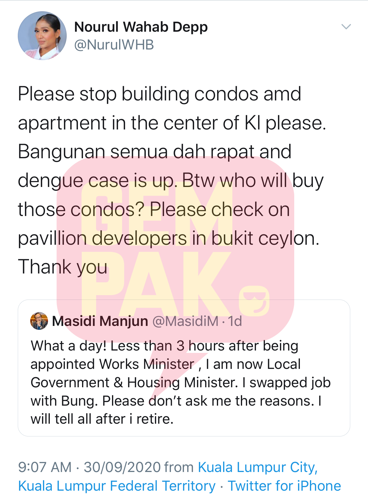 "Siapa yang akan membeli kondominium tersebut? Tolong periksa pemaju-pemaju di Bukit Ceylon. Terima kasih," tulis Nourul.