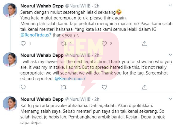 Nourul merujuk komen yang ditulis menerusi medium Instagram seorang pengguna selepas ciapannya pada Rabu.