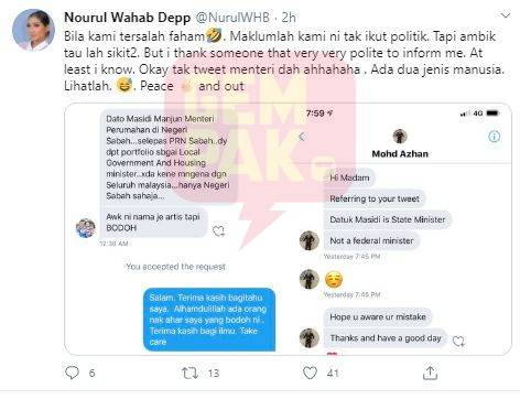 "Saya sudah mengaku kesilapan saya dan saya mohon maaf kerana tersalah tweet menteri. Beliau hanya bertanggungjawab untuk negeri Sabah, bukan di persekutuan.