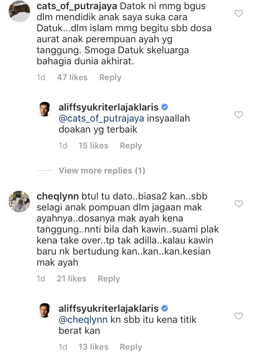 Rata-rata pengikutnya memuji cara Aliff mendidik anak perempuannya malah mendoakan semoga menjadi anak yang solehah.