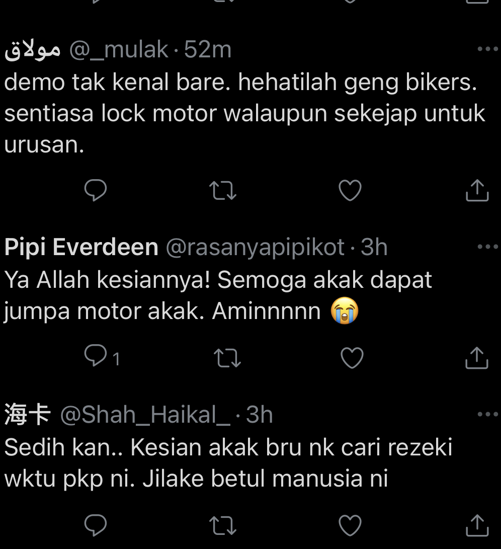 Pada masa sama, tinjauan Gempak di Twitter juga mendapat ramai netizen kini sedang berganding bahu menyebarkan maklumat untuk mencari motosikal berkenaan.