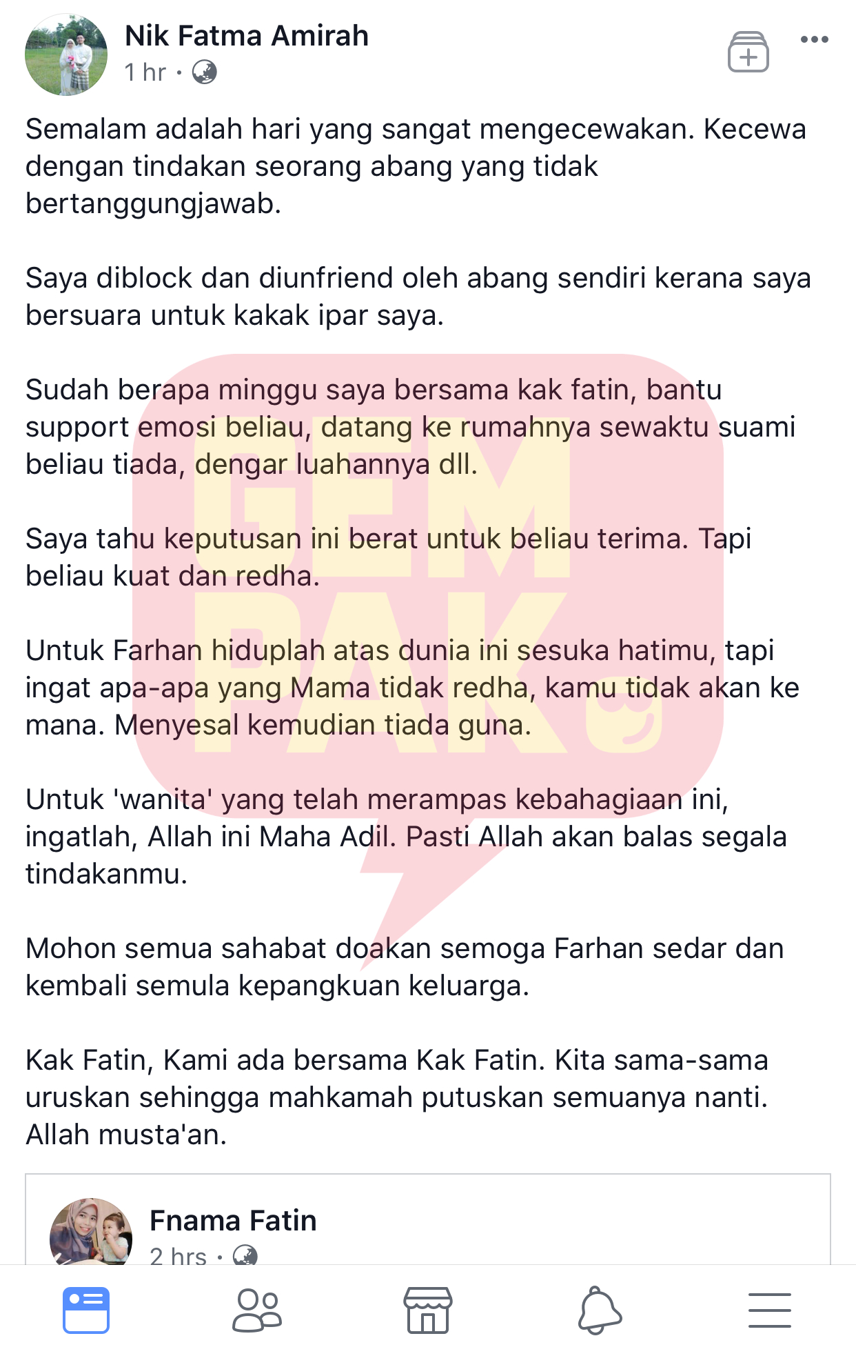 "Kak Fatin, kami ada bersama. Kita sama-sama uruskan sehingga mahkamah putuskan semuanya nanti," ujarnya lagi.