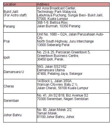 Antaranya Pusat Khidmat Pelanggan Astro di Jalan Burmah (Pulau Pinang), Seberang Prai, Damansara Utama, Ipoh, Cheras, Seremban dan Johor Bahru.