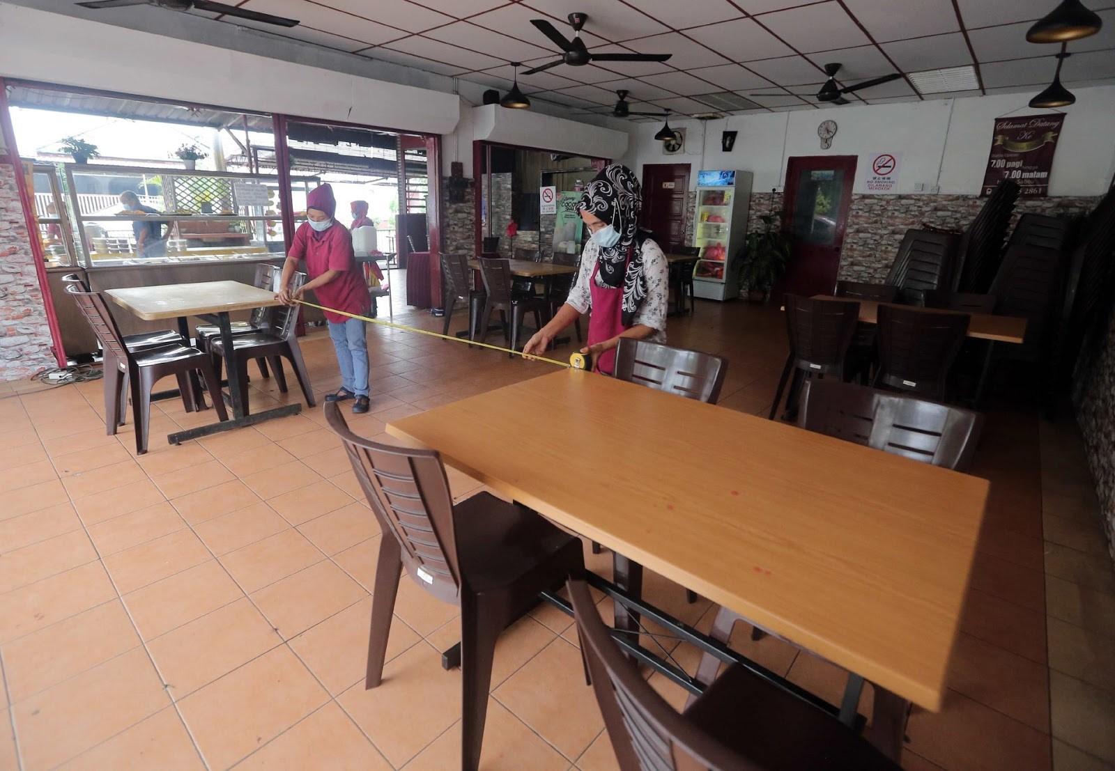 - Pastikan meja disusun dengan jarak sekurang-kurangnya dua meter antara satu meja dengan meja yang lain. Ini penting supaya di tengah-tengahnya ada ruang yang agak luas untuk pelanggan dan pekerja lalu, dan ada jarak yang selamat antara pelanggan yang makan di situ. Untuk pastikan penjarakan sosial ketika pelanggan makan, Pak Salleh boleh letak notis di setiap meja hanya satu orang, dua orang atau tiga orang dibenarkan makan bergantung kepada saiz meja. Kalau meja kecil mungkin satu orang atau dua orang sahaja dibenarkan. Kalau meja besar, mungkin tiga orang atau empat orang. Ini Pak Salleh kena tentukan.