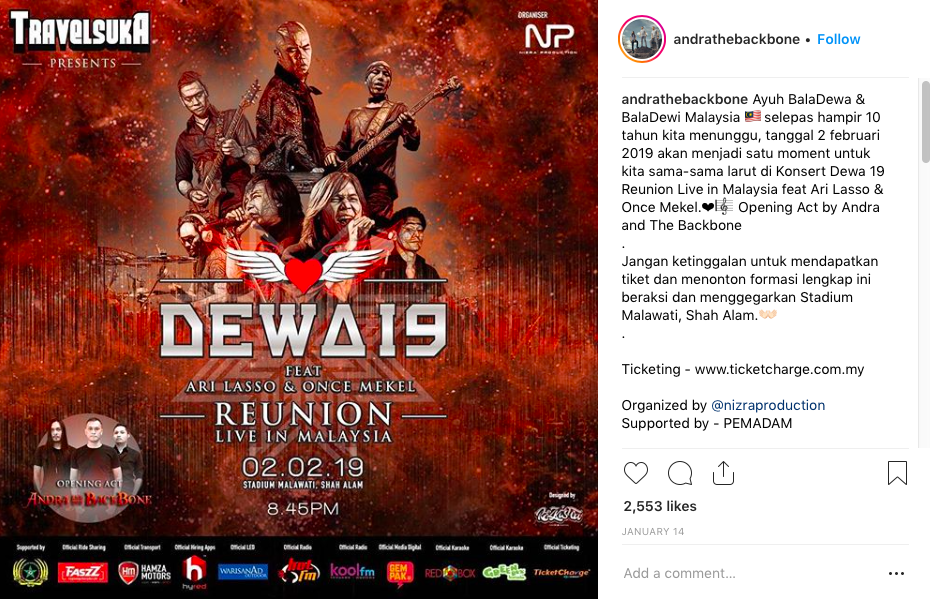 Sebelum larut bersama Ahmad Dhani, Ari Lasso, Once, Yuke, Andra Ramadhan, Agung dan Tyo Nugras, Konsert Dewa 19 - Reunion Live In Malaysia akan dihangatkan terlebih dahulu oleh Andra and The Backbone.