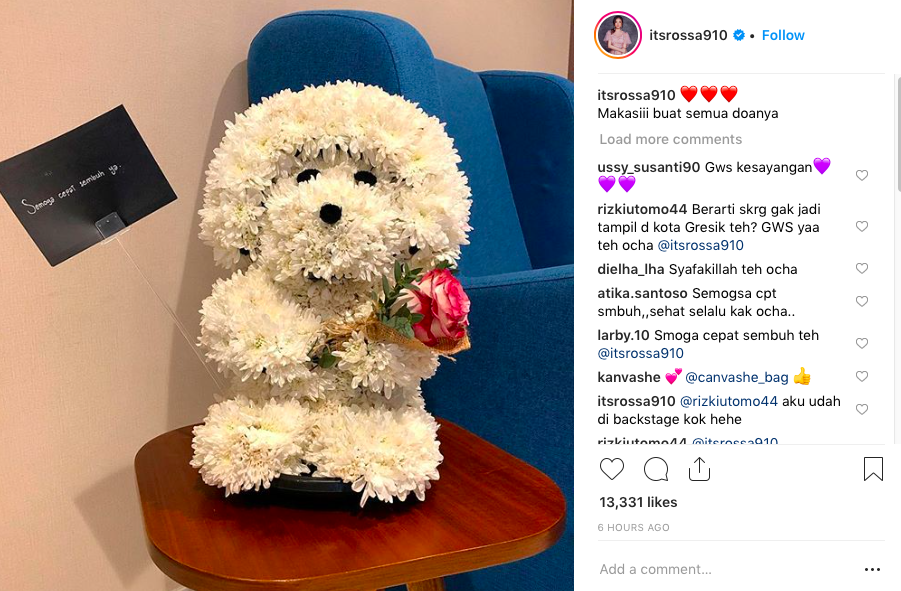 Pun menerusi unggahan foto teddy bear putih bersama sekuntum bunga yang terselit kalimat semangat ‘semoga cepat sembuh ya’, Rossa mengucapkan terima kasih karena doa yang telah diberikan kepadanya saat dirinya sedang sakit.