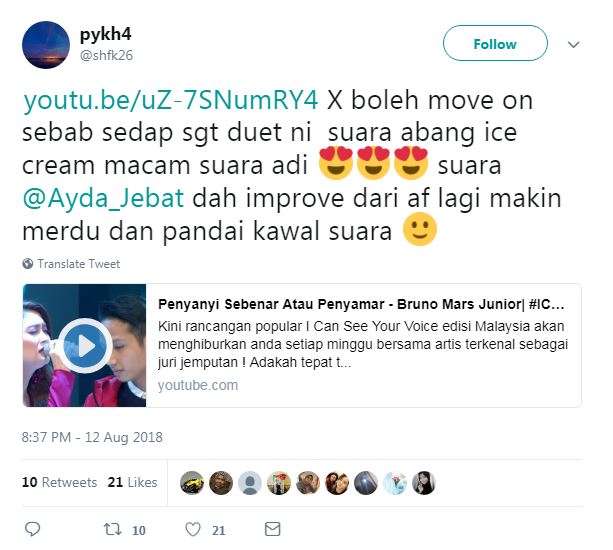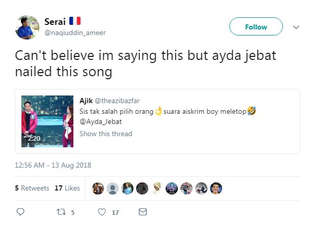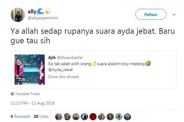 Terbaru, menerusi salah sebuah entri yang viral di laman Twitter, netizen yang menggunakan nama @theazribazfar berkongsi sedutan video Ayda berduet dengan peserta yang digelar Abang Ais Krim.