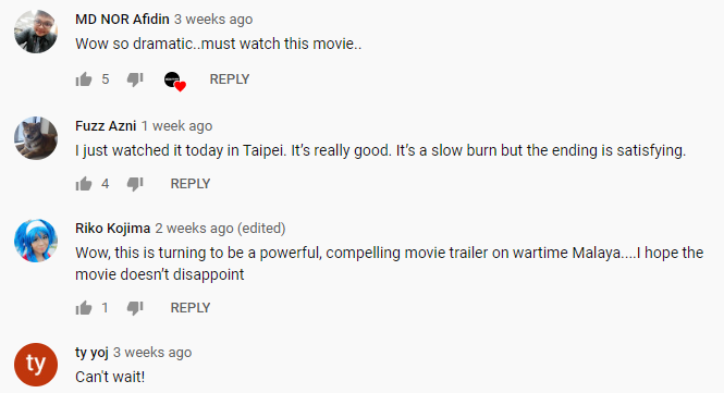"Wow, ia benar-benar hebat, trailer filem yang cukup menarik yang memaparkan zaman perang di Malaya. Saya harap filem itu nanti tidak mengecewakan," tulis sebahagian netizen di ruangan komen.