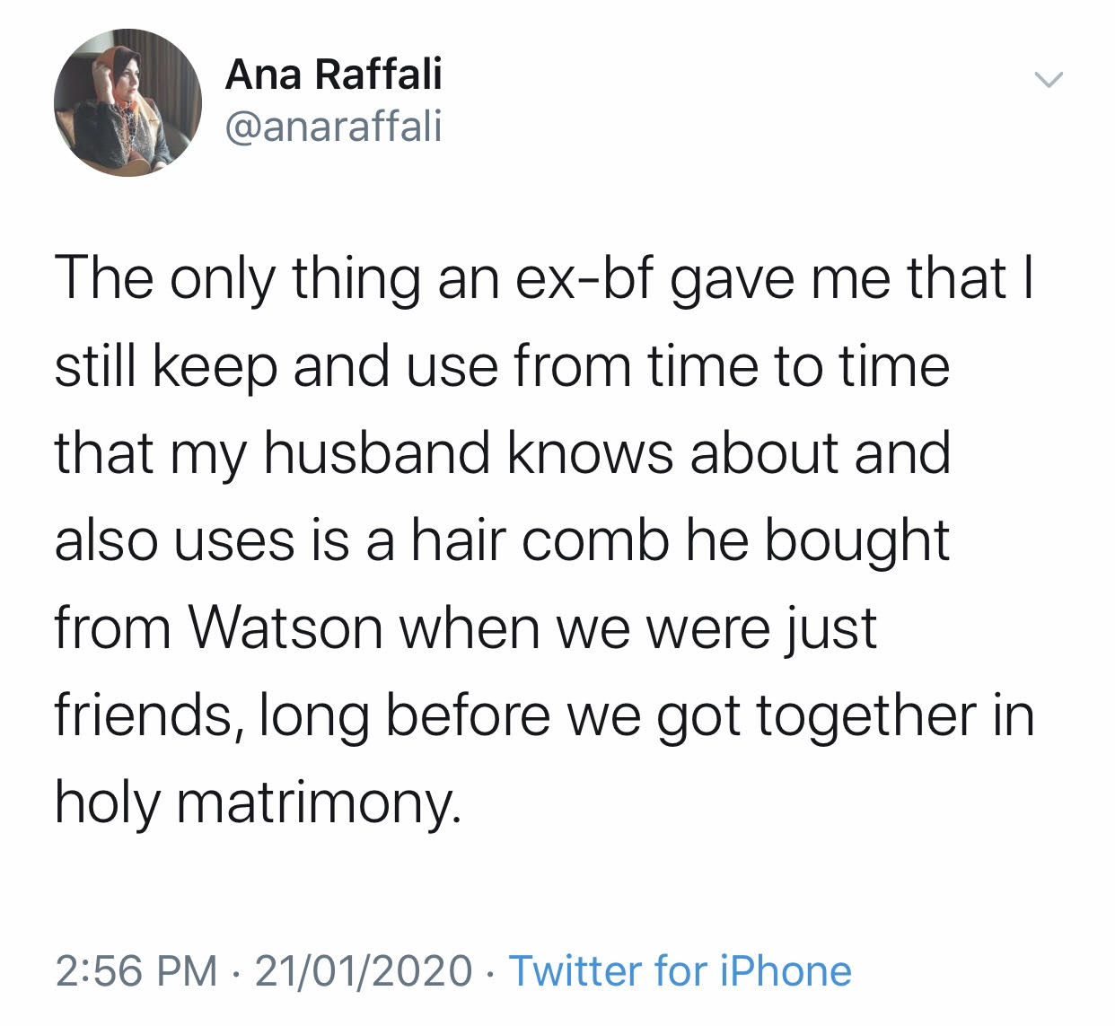 "Satu-satunya benda yang dihadiahkan oleh bekas teman lelaki saya dan masih diguna pakai sampai sekarang ialah sikat rambut yang dibeli dari Watson ketika kami masih berkawan. Suami saya pun tahu mengenainya...