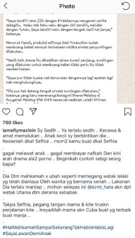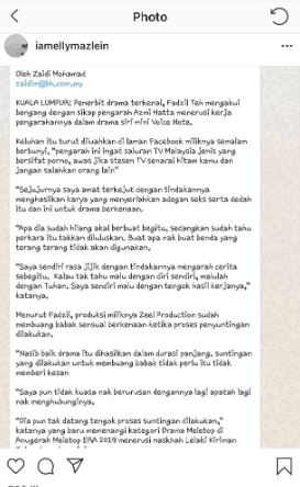 Di entri yang sama, Elly turut berkongsi potongan artikel berkaitan kenyataan mendakwa Azmi mengarah drama berunsur seks.