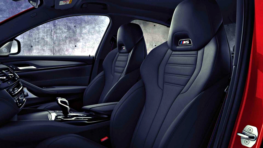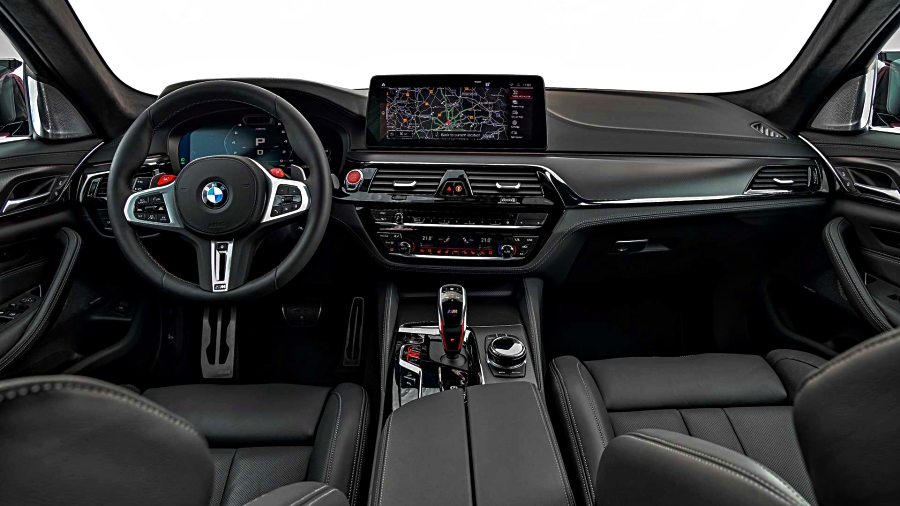 Untuk ruang dalaman, M5 dan M5 Competition menerima penambahan butang Setup dan M Mode pada konsol tengah bagi memberikan pemandu akses terus kepada mod pemanduan. Satu ciri eksklusif untuk M5 Competition adalah upholsteri kulit Merino Midrand Beige/Black.