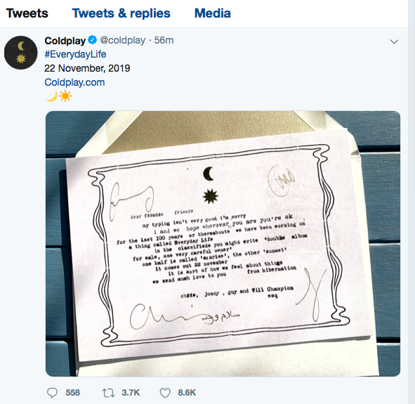 Hal yang lebih membahagiakan adalah mereka akan merilis album tersebut secara ganda. Album Everyday Life itu kata Coldplay lewat sebuah surat yang ditulis secara kuno dan diunggah di media sosial, ia juga punya nama Sunrise dan Sunset.