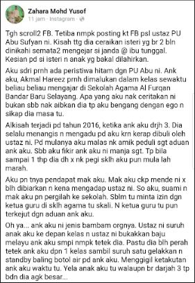Seorang wanita bernama Zahara Mohd Yusof mendedahkan kisah anak lelakinya, Akmal Hareez yang pernah dimalukan di dalam kelas ketika Pencetus Ummah (PU) Abu Sufyan Muhamad Mokhtar Rozaidi mengajar di sebuah sekolah agama.