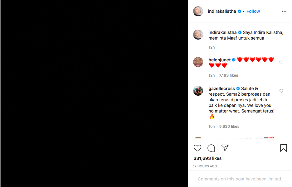 Di akun Instagramnya, Indira memasang latar hitam pada bahagian foto sementara menuliskan kata maaf di kolom caption.
